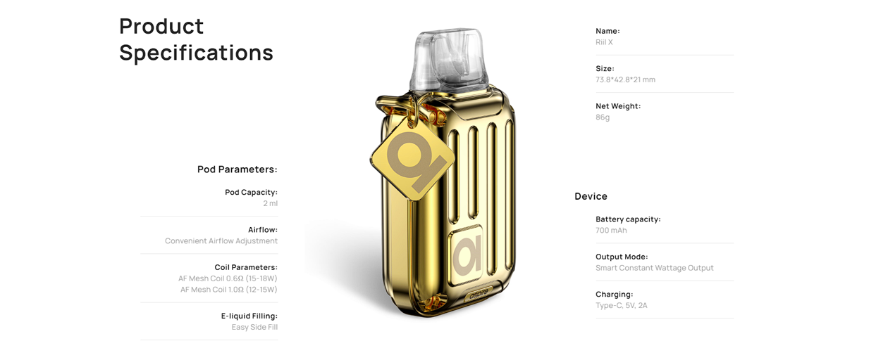 Η Aspire δημιούργησε το RiiL X Kit, το πιο απίστευτο στυλ και τον πιο elegant σχεδιασμό που έχουμε δει έως τώρα σε Kit. Tο ξεχωριστό μεταλλικό πλαίσιο και η σύγχρονη πολυτελής εμφάνιση έρχεται σε δύο χρώματα, ασημένιο και χρυσό επιπλατινωμένο 24Κ! Ένα δυνατό Kit, λαμπερό και πολυτελές σαν κόσμημα!!